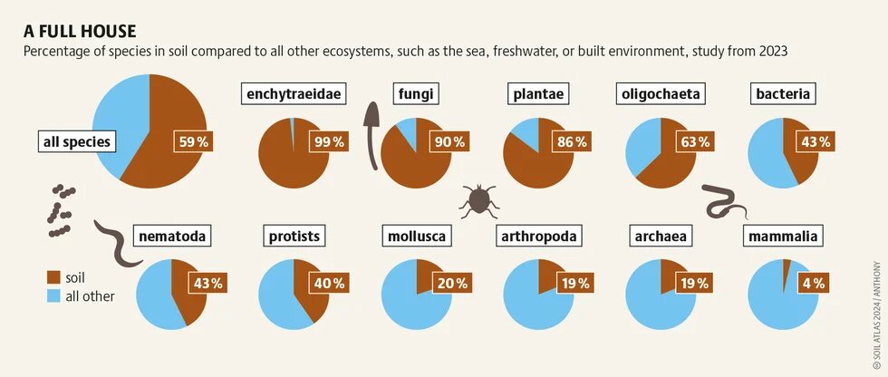 Soil provides a home for a vast number of species: It is the most biodiverse habitat. Almost two-thirds of all species worldwide reside there