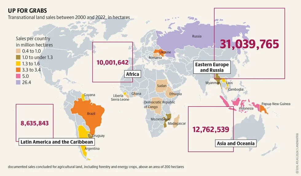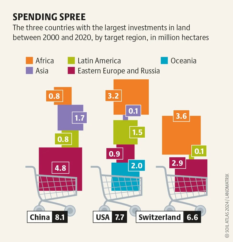 How countries of the Global North are complicit in these land grabs can be illustrated by the case of Germany. For example, the Berlin investor Amatheon has acquired over 40,000 hectares of land in Zambia. In 2009, Deutsche Bank invested at least 279 million euros through its subsidiary DWS in firms that bought or leased cultivable land, resulting in the acquisition of over 3 million hectares of land in Africa, South America, and Southeast Asia. The Ärzteversorgung Westfalen-Lippe, a pension fund for doctors, invested 100 million dollars in a global land fund, which, in Brazil alone, acquired 133,000 hectares of land, in particular for large-scale soybean monocultures.
