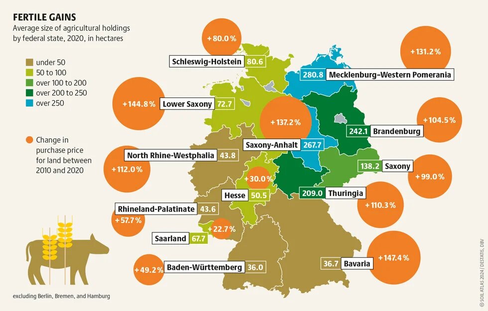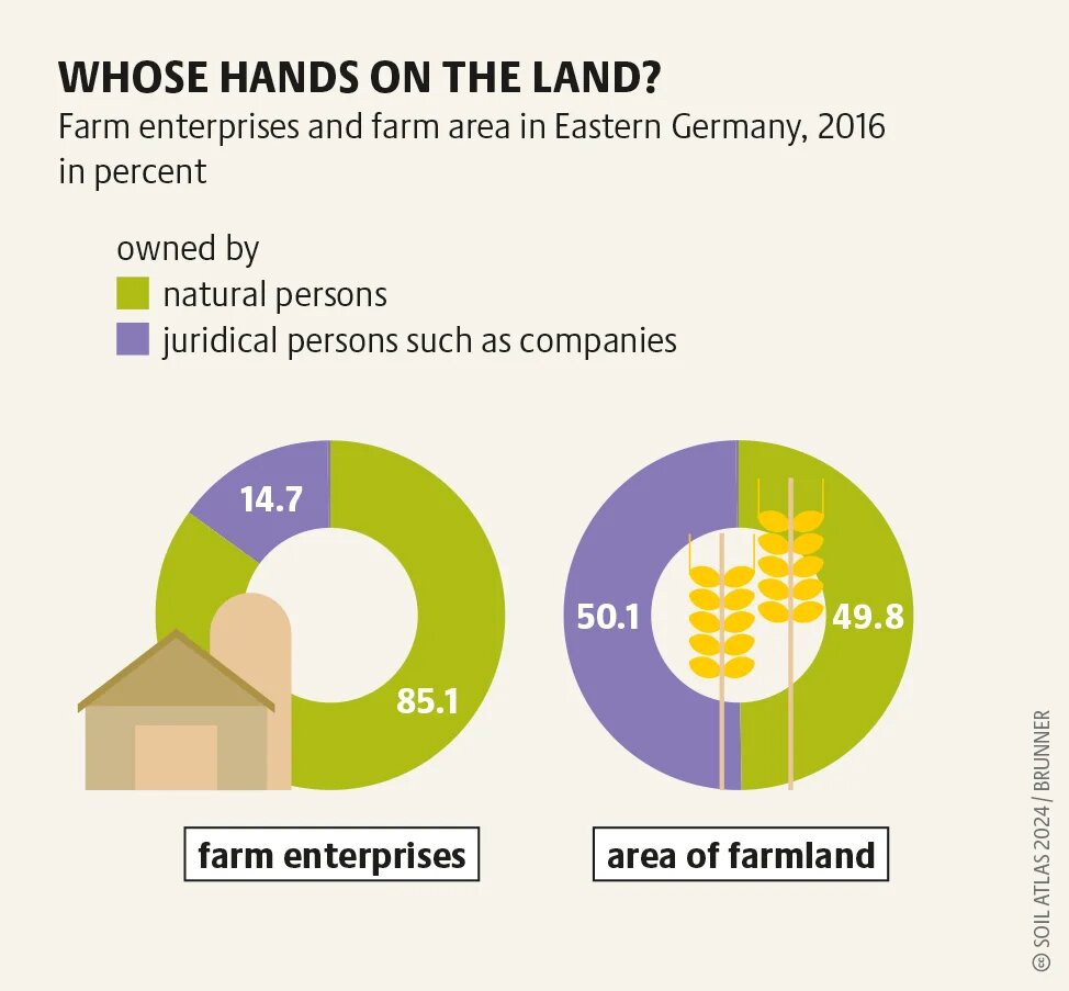 In eastern Germany, farms owned by juridical persons average 762 hectares, while in the west, the average is only 56 hectares